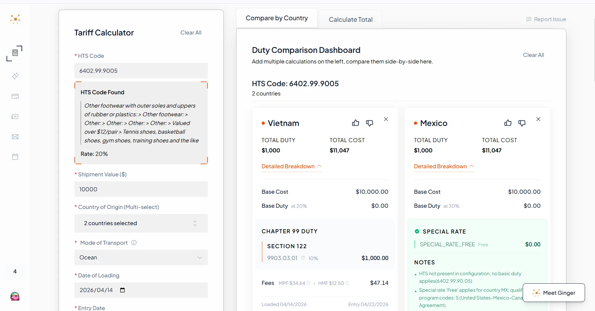 Ginger 为你提供一份可打印的到岸成本明细,完整展示关税叠加。你带着数据去谈判,而不是靠直觉。
